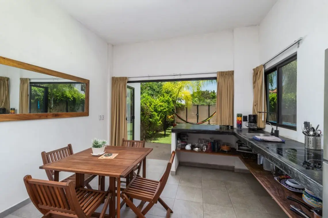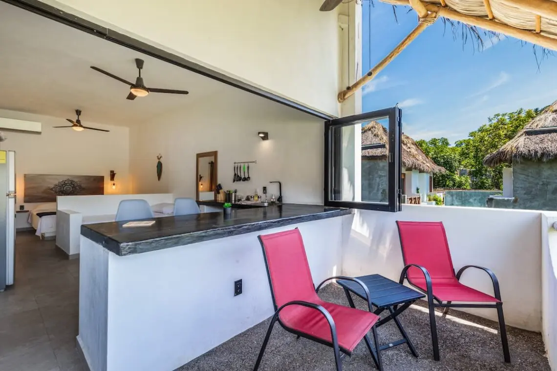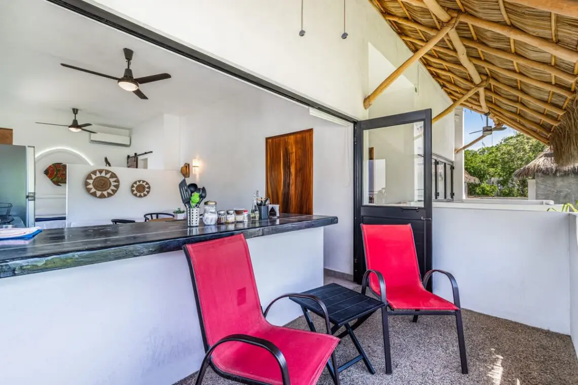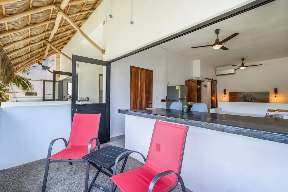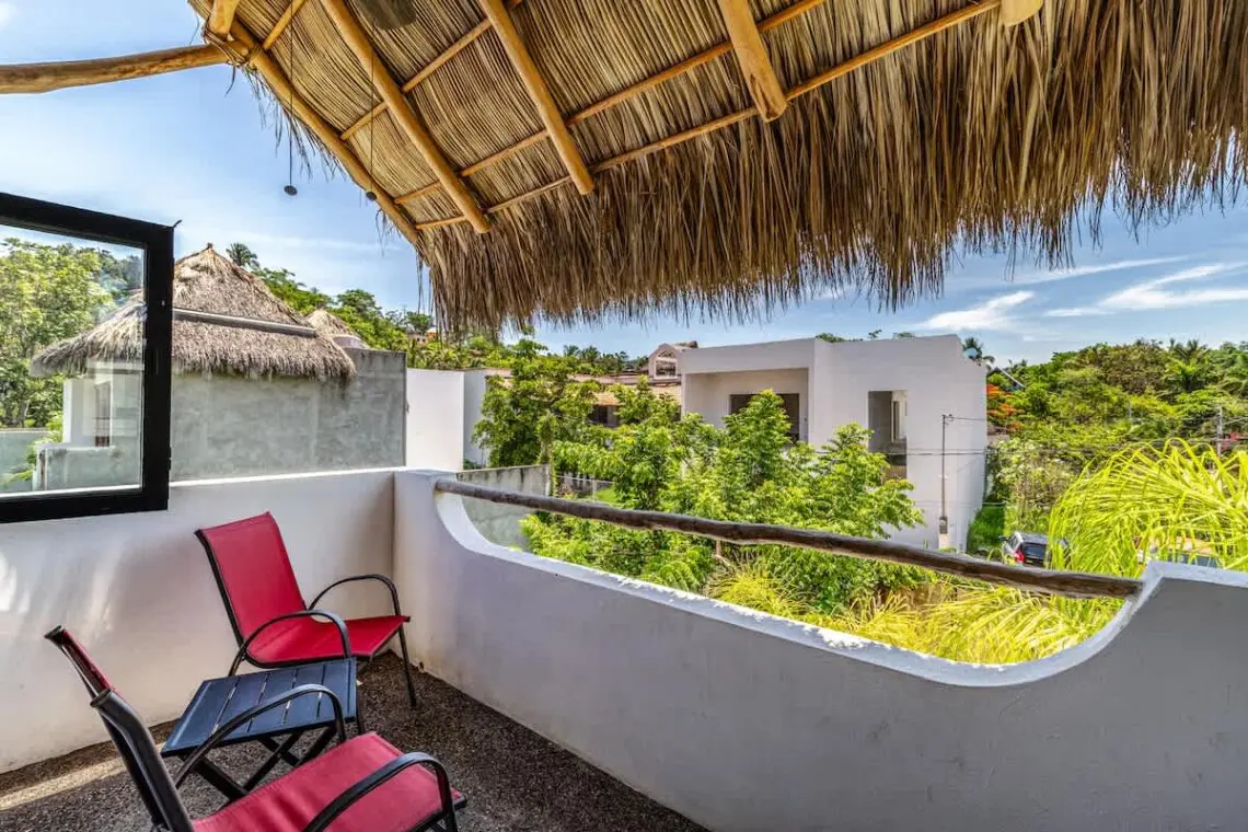 Downstairs, relax on the shaded terrace with outdoor furniture; upstairs, enjoy the balcony perfect for morning coffee or evening sunsets. The property offers peaceful seclusion just a short walk from San Pancho’s vibrant town center and beach.