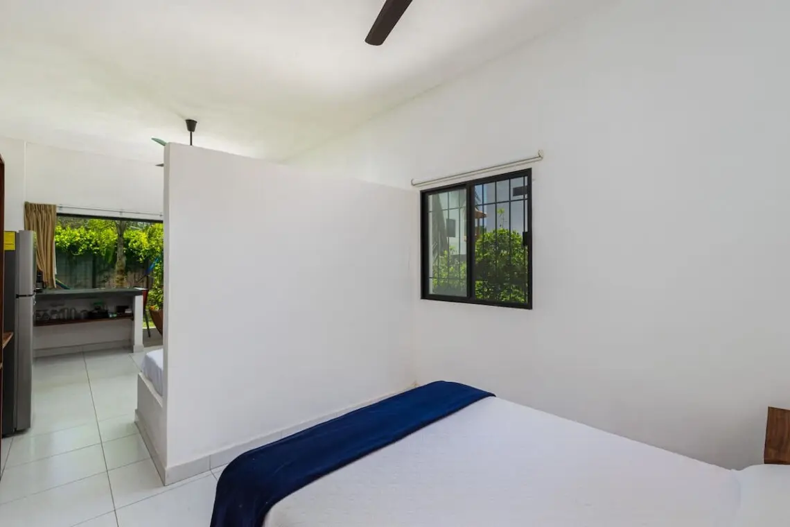 The house is divided into 4 1 BR/1 BA lofts – 2 upstairs and 2 downstairs. They are divided by the stairwell. You’ll have 4 sets of keys for the 4 units. Each BR Studio is completely independent and as private as you want it to be – or as open by just sliding back the windows and door to the outside. 1 Queen and 1 Single bed in each unit.