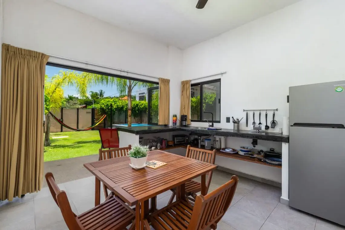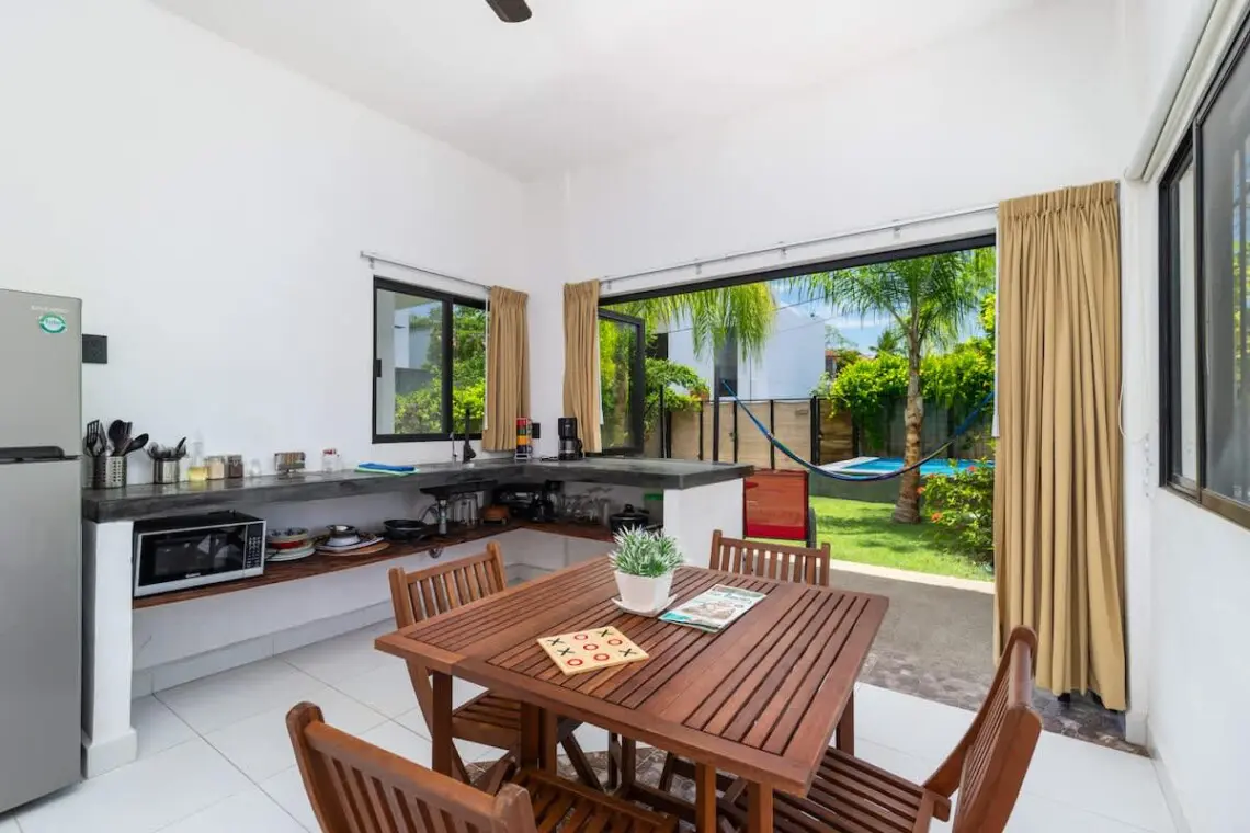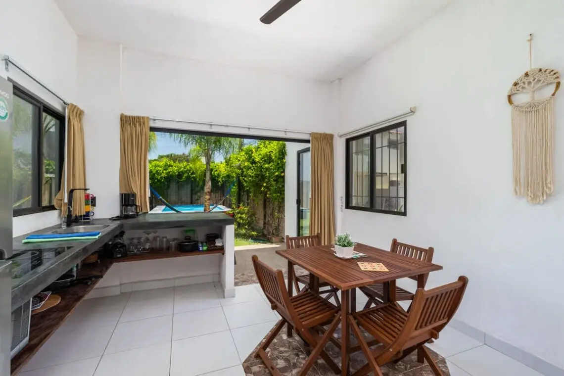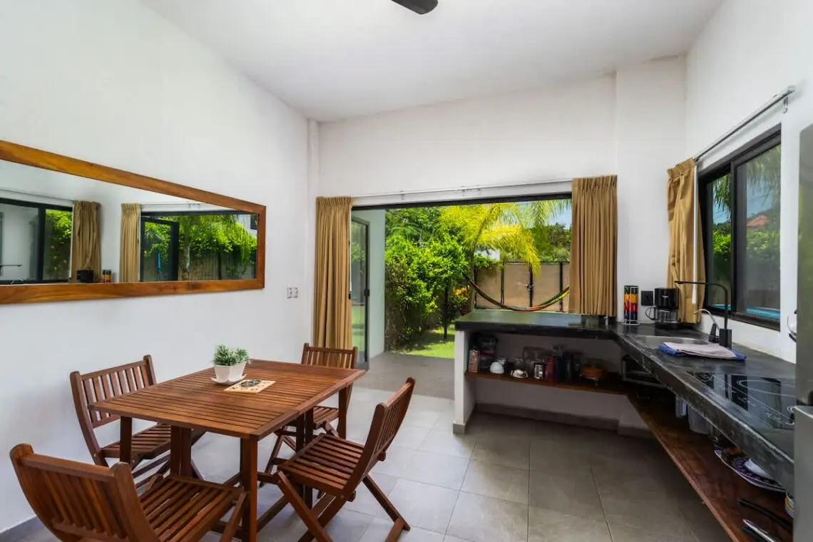 Spacious 4 BR/4 BA home with 4 mini kitchens—perfect for families or groups. Large sliding glass door/windows open to a lush yard, pool, and palm-shaded hammocks. The downstairs terrace and upstairs balcony offer outdoor dining and lounging. Located on a quiet street in San Pancho, just minutes from shops, cafés, markets, surf spots, and the beach. A peaceful escape with room to gather and space to retreat.