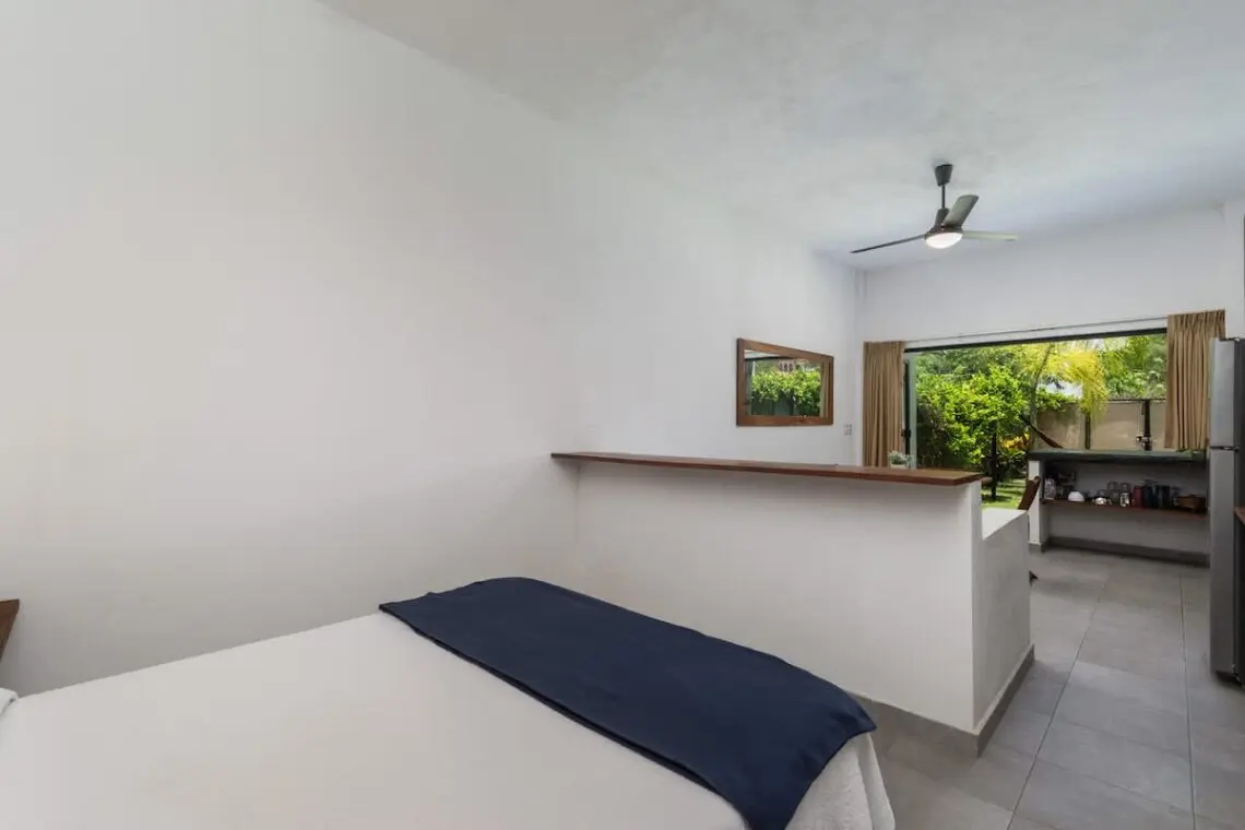 Enjoy the full home—both the upstairs and downstairs units combined—for a total of 4 bedrooms, 4 bathrooms, and 4 kitchenettes. This flexible layout is ideal for larger groups, multi-family travelers, or friends wanting both communal and private space. Large sliding glass doors create an indoor/outdoor flow, opening onto a lush shared garden with a pool and hammocks swaying between palm trees.