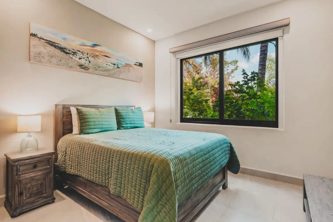 The second bedroom offers a cozy queen bed and ample closet space, complemented by a large window that frames the complex’s lush landscaping, adding a touch of nature’s tranquility to the room.