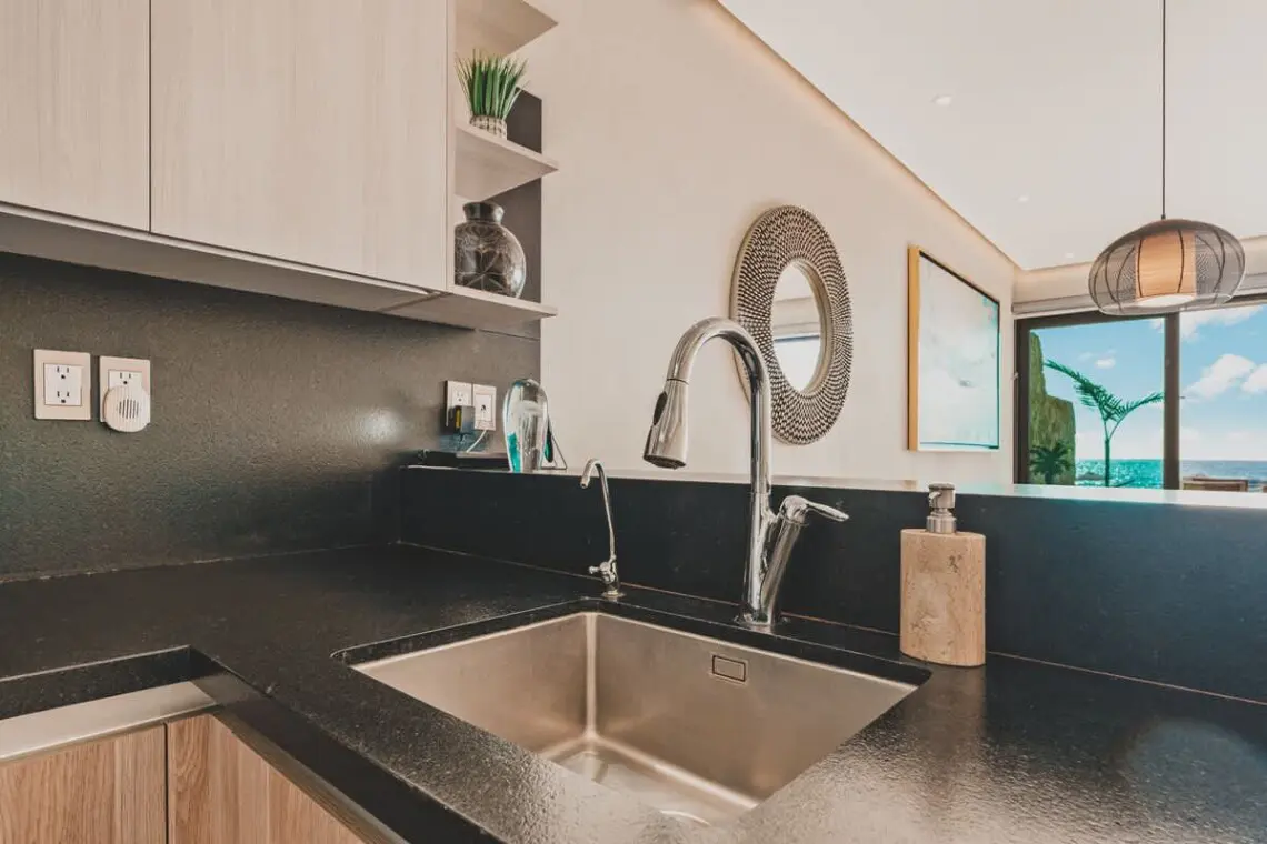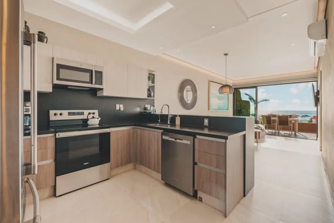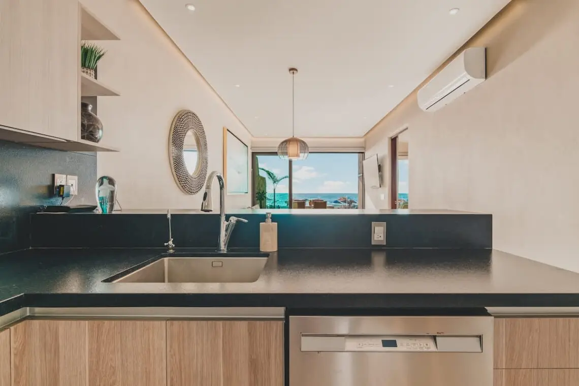 Black granite countertops and views of the ocean from the sink elevate the cooking experience.