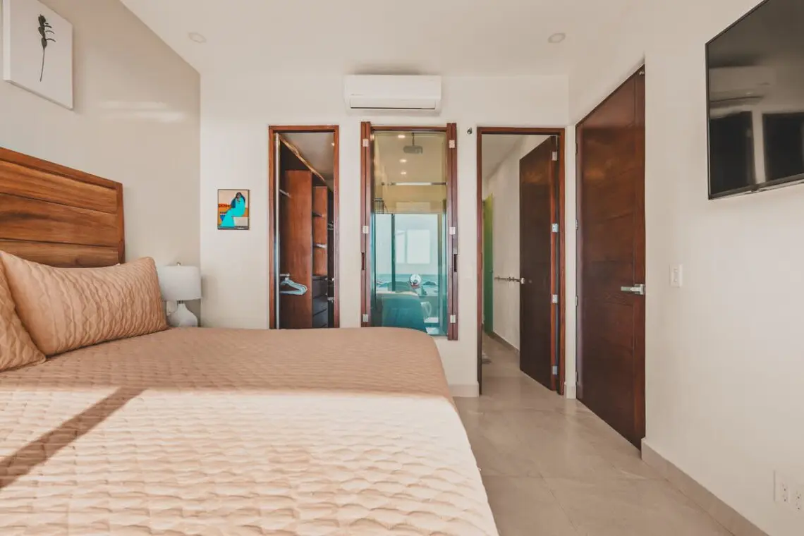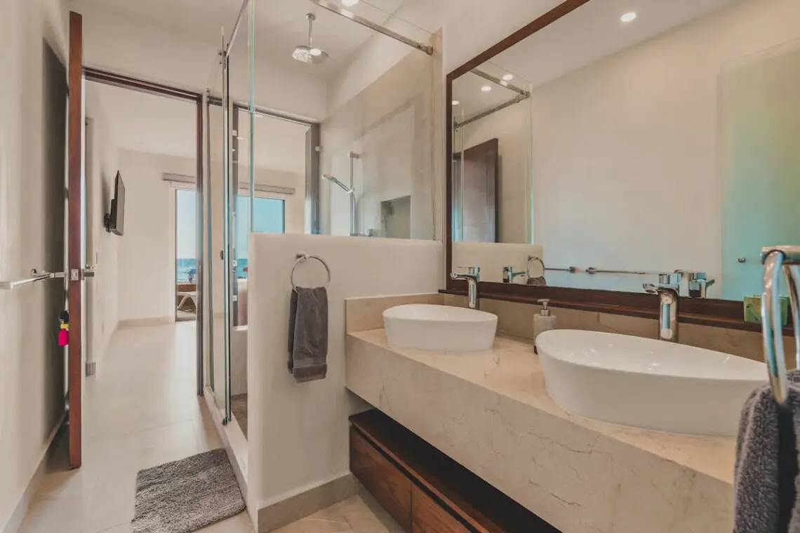 The main bedroom is a sanctuary of relaxation, featuring a comfortable king-sized bed and a spacious walk-in closet. It also features a large slider door that provides direct access to the balcony, allowing guests to wake up to the breathtaking ocean vista. It has an ensuite bathroom equipped with a large walk-in shower adorned with glass walls and a dual vanity for added convenience.
