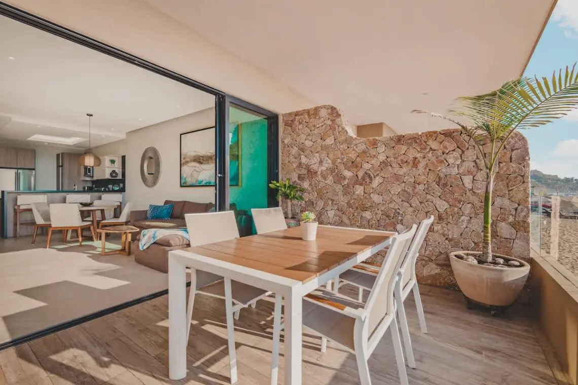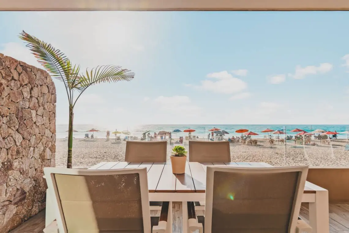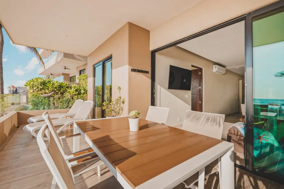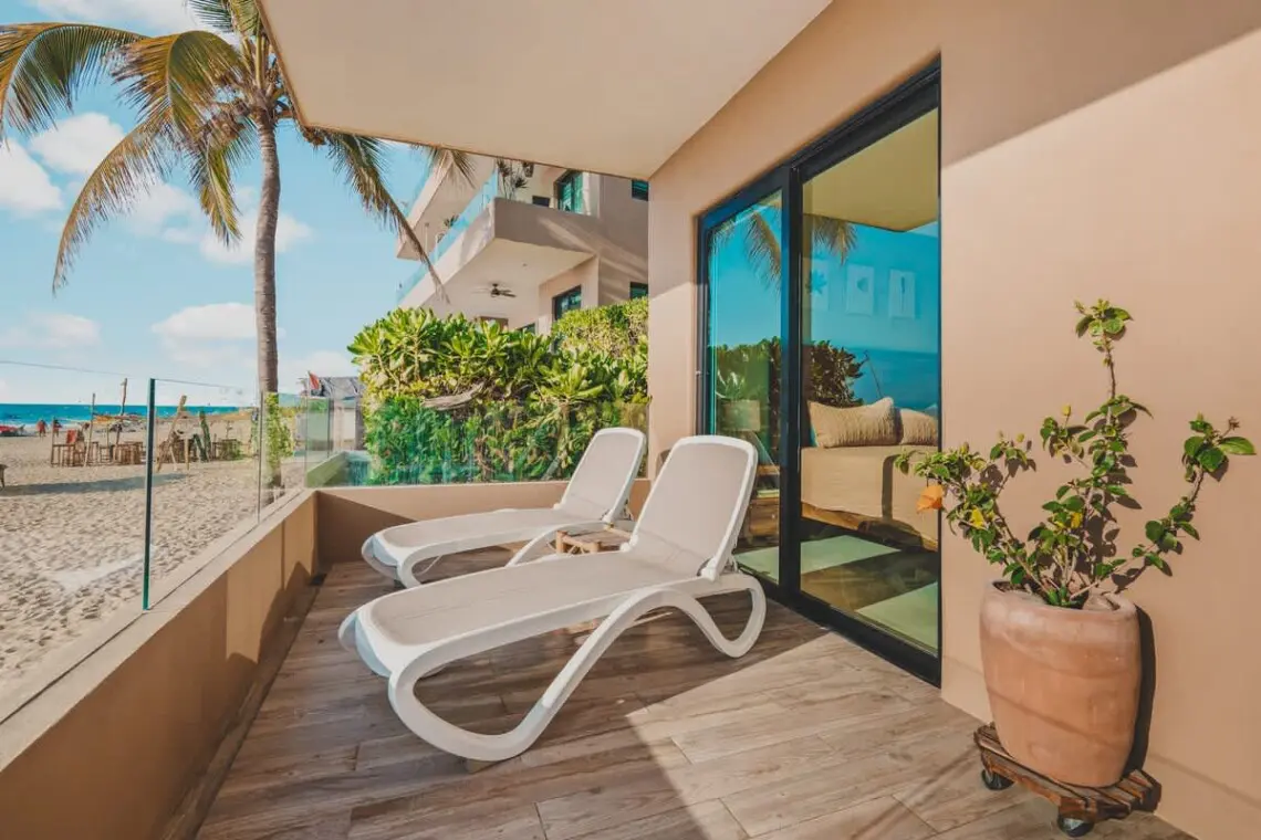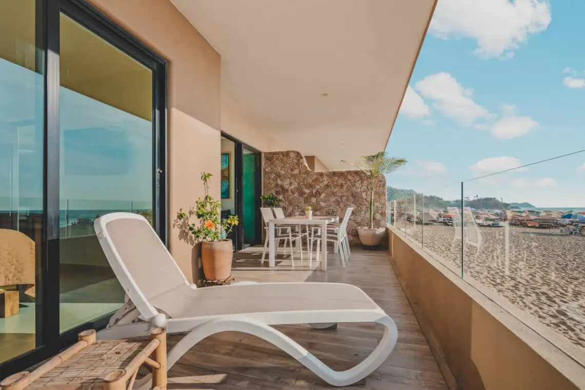 Guests are treated to breathtaking beach and ocean views from the private balcony, a large dining table for al fresco meals, and two lounge chairs perfect for basking in the sun.