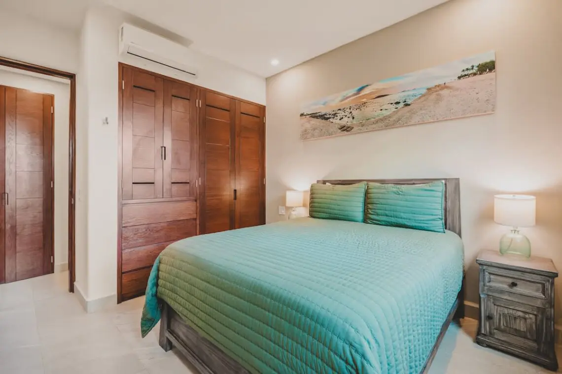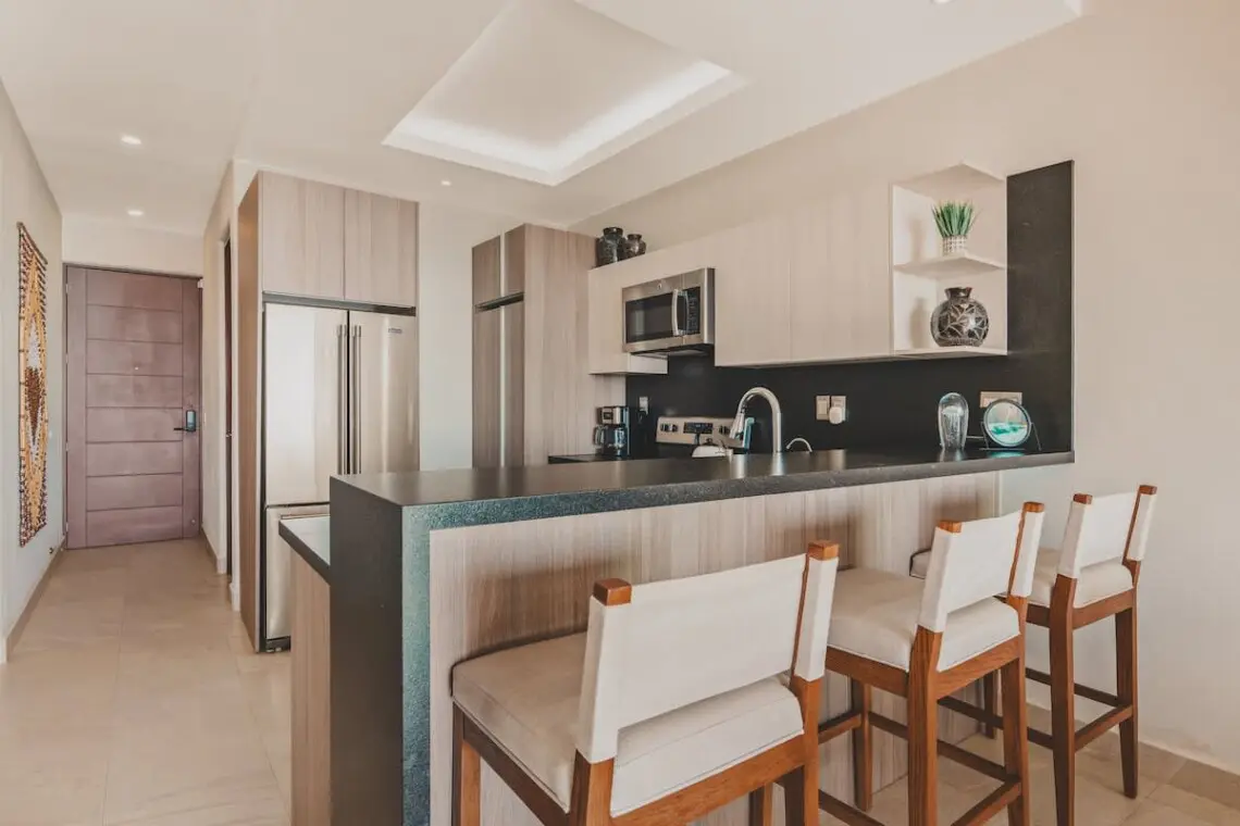 The condo has a fully equipped kitchen, Wi-Fi, air conditioning, a washer and dryer, and 24-hour security personnel.