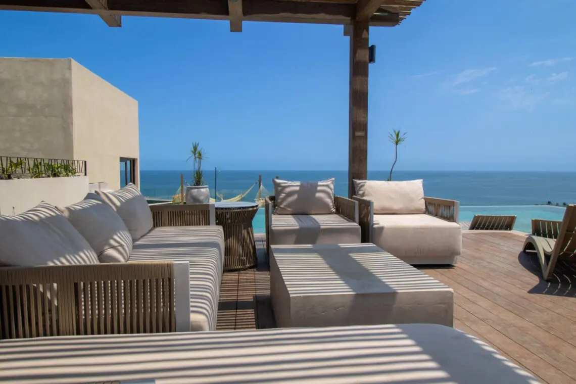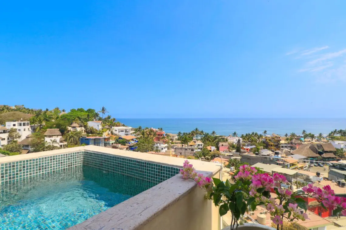 Brand-new luxury penthouse in the heart of Sayulita. Enjoy sweeping ocean and jungle views from your private corner plunge pool, with the sights and sounds of town—distant mariachi, ocean breeze, and street tacos—carrying through the treetops. This 2BR, 2BA retreat features a fully equipped kitchen with reverse osmosis water filtration. Indulge in rooftop poolside lounging, hot tub soaks, yoga space, hammock swings, and a cocktail bar—your serene sanctuary above it all.