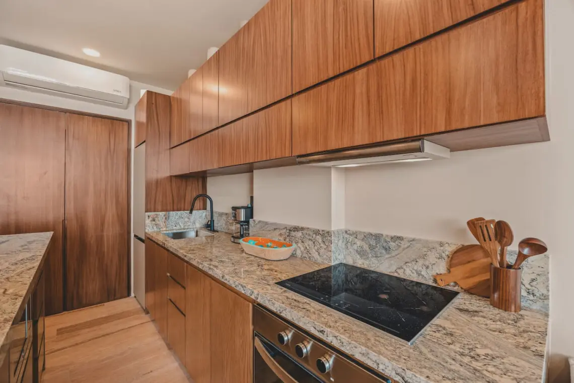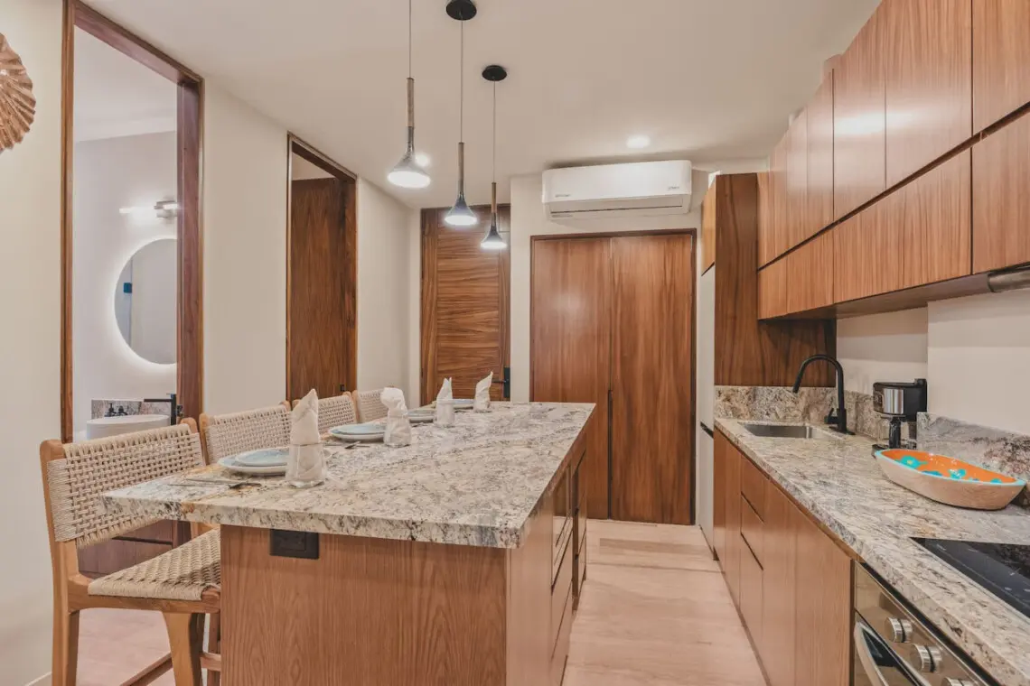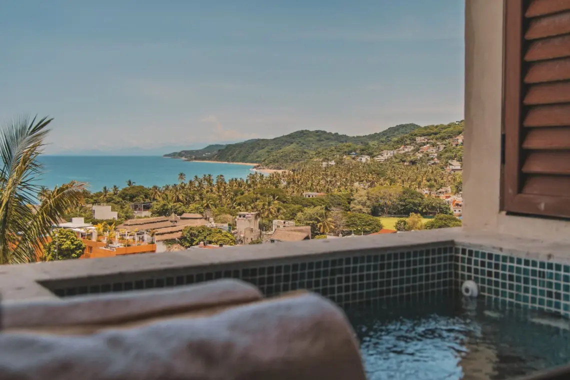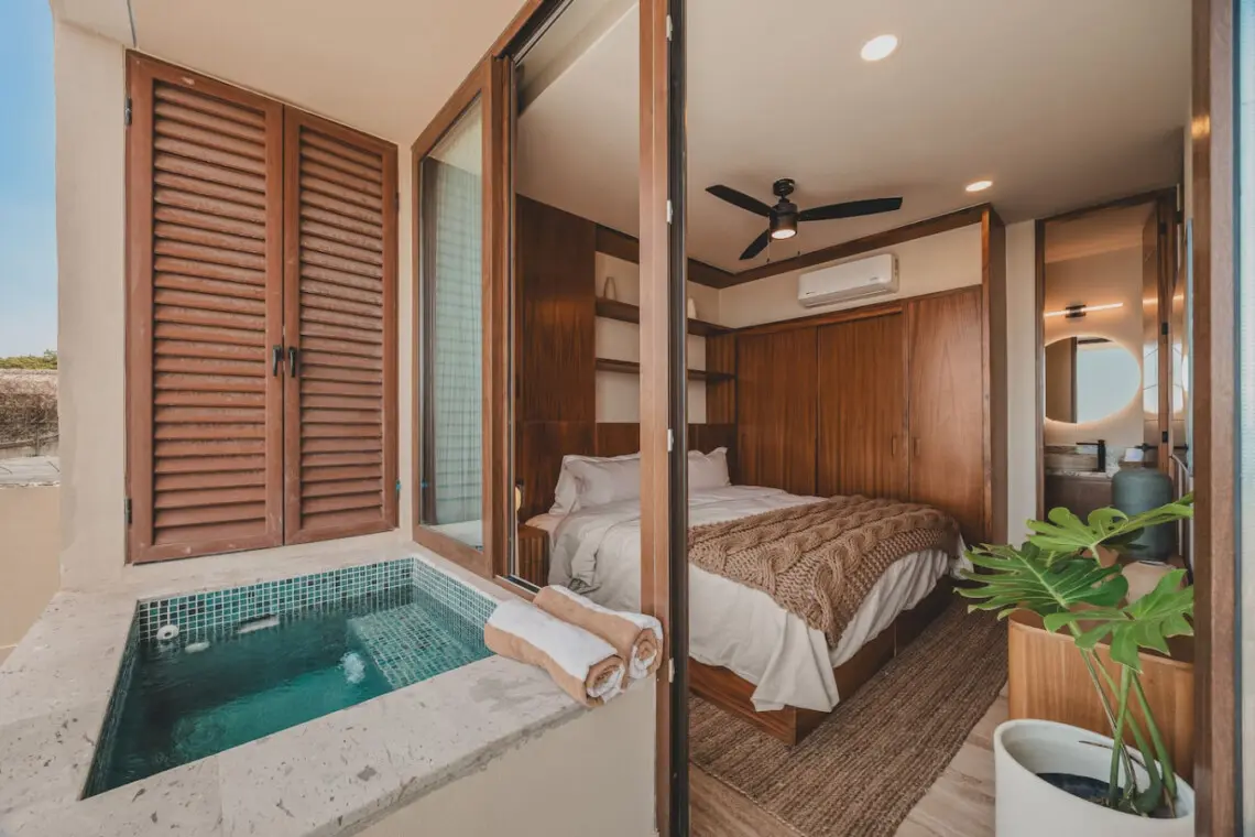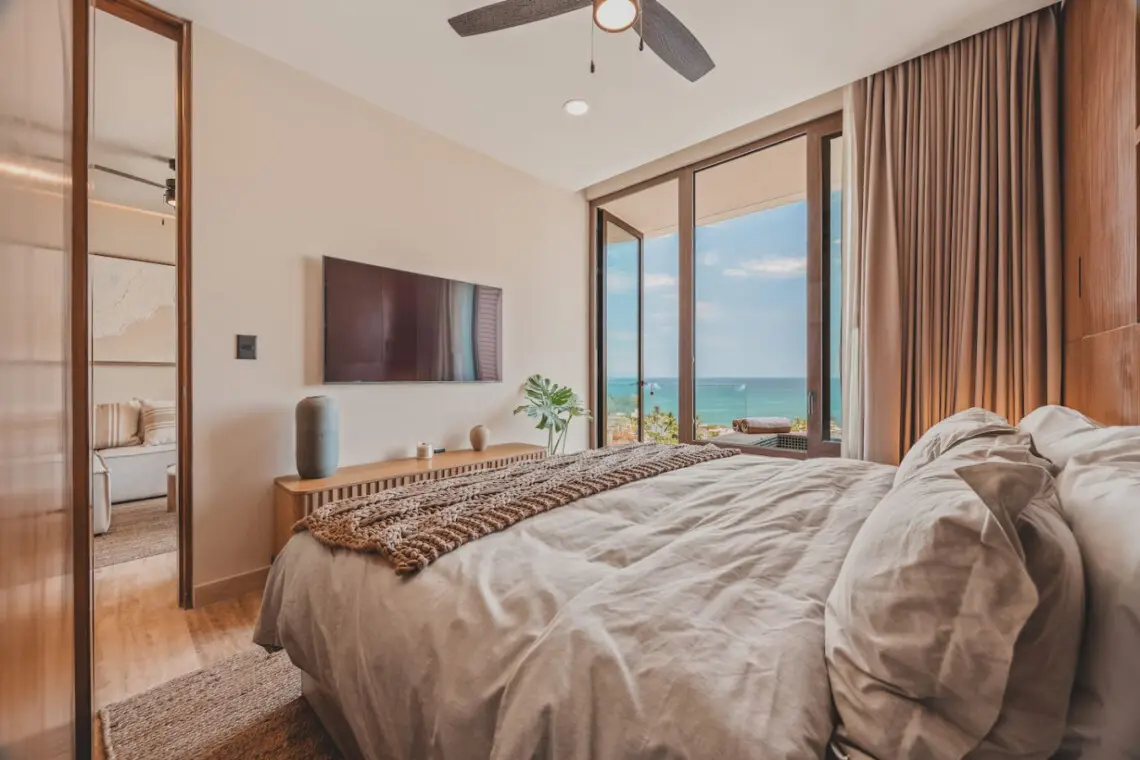 Welcome to your Sayulita escape at Caivama! This brand-new 2-bedroom, 2-bath condo blends comfort and style with sweeping ocean and jungle views. Lounge in your private plunge pool, enjoy sunset cocktails on the balcony, or head up to the rooftop for pools, a hammock lounge, yoga space, and a bar with panoramic views.