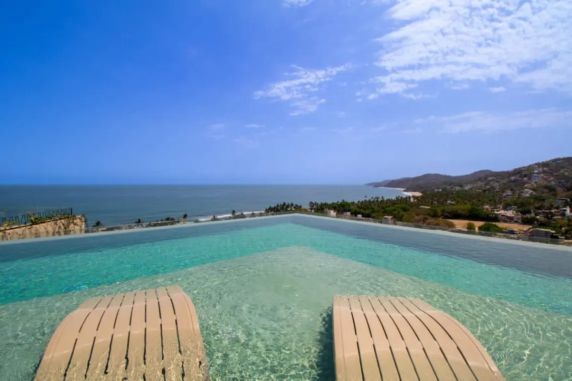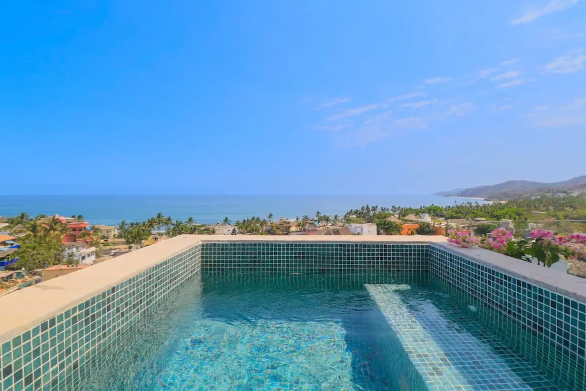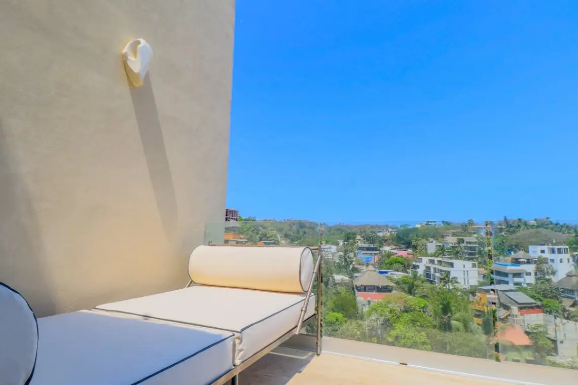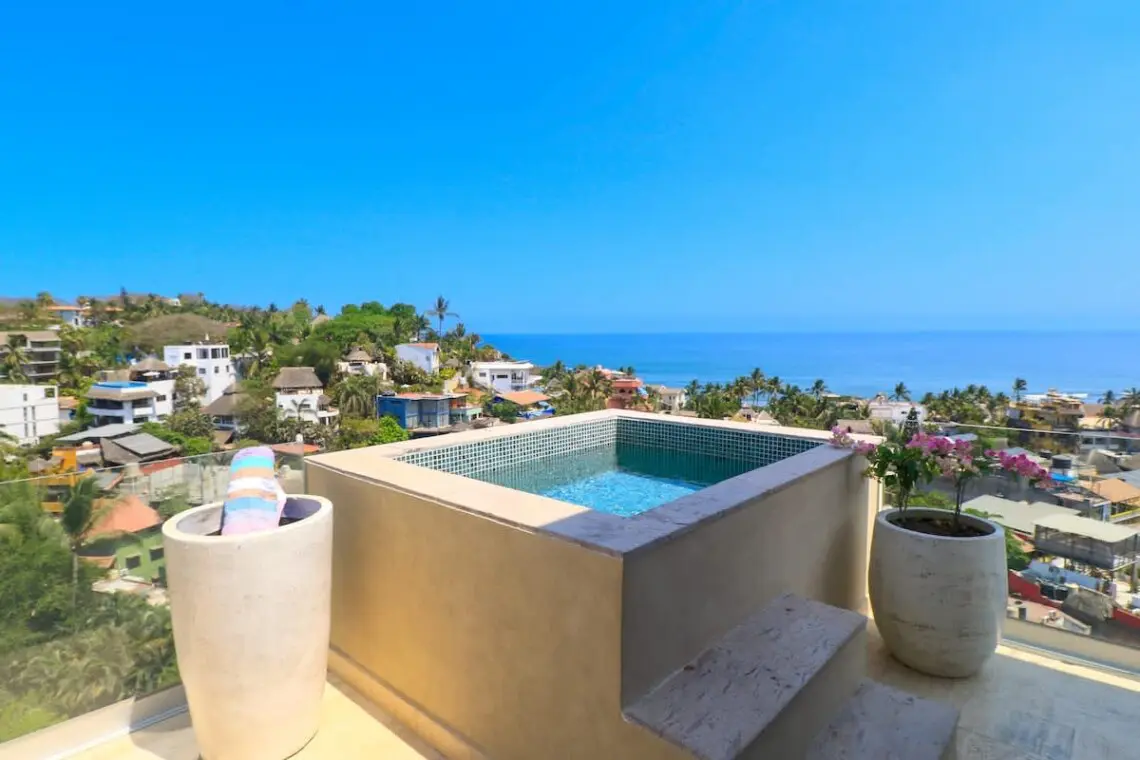 Brand-new luxury penthouse with a private corner plunge pool and sweeping ocean, jungle, and Sayulita town views. This 2BR/2BA retreat offers a modern kitchen with filtered water, fast WiFi, and A/C throughout. Enjoy rooftop infinity pool, hot tub, yoga deck, hammock lounge, and cocktail bar. Walk to beach, surf, and restaurants, then return to your serene sanctuary—perfect for couples, families, or remote workers seeking wellness and coastal charm.