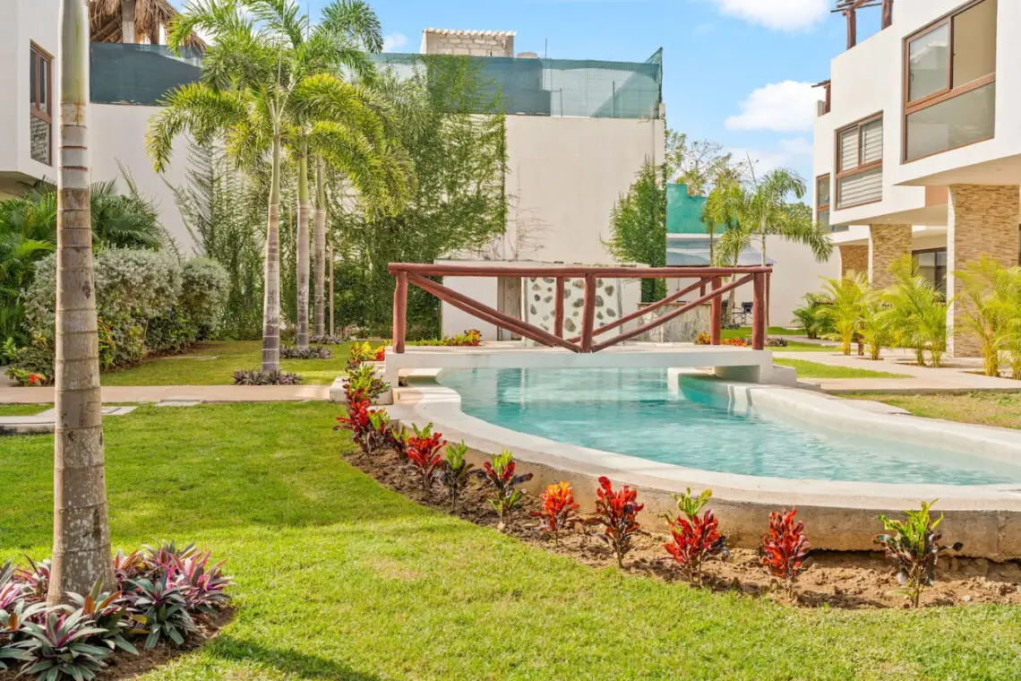 Step outside to lush tropical gardens that exude jungle vibes, complete with accent lighting that sets a tranquil ambiance. Enjoy access to the large community pool or take in the breathtaking jungle views from your private rooftop lounge area.